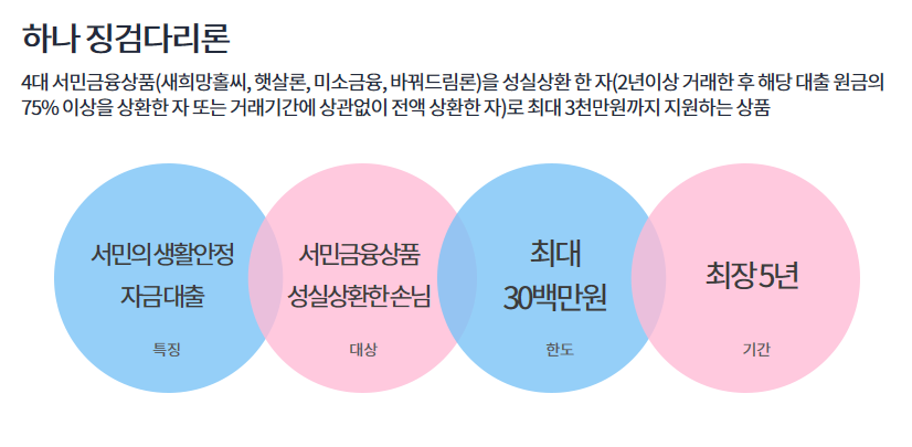징검다리론 대출을 이용하시려면, 우선적으로 4대서민금융인 새희망대출, 햇살론, 미소금융, 바꿔드림론 중 하나를 이용하시고 성실상환을 하신 분들이여야 합니다.