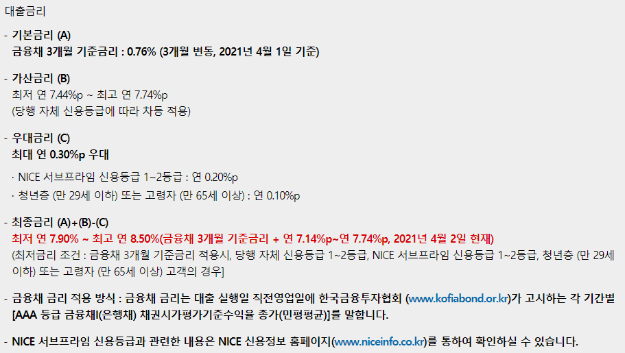 위 내용을 토대로 최종금리를 살펴보면 연 7.90%~연 8.50% 정도라고 할 수 있겠습니다. (21.4.2일 기준)