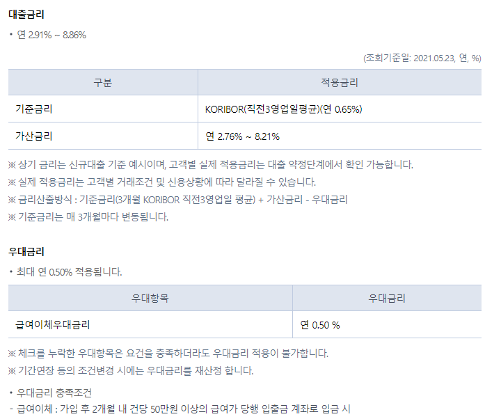 금리는 기준금리+가산금리-우대금리로 산출이 되는데요. 기준금리는 21.05.23 기준으로 기준금리 KORIBOR(직전3영업일평균)연 0.65%이며, 가산금리는 연 2.76%~8.21%입니다.