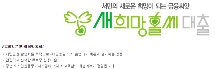 1금융권에서 16군데서 취급을 하고 있는 상품이기에 조건만 되시면 지역에 상관없이 어렵지 않게 대출을 받아보실 수 있는데 오늘은 SC제일은행 새희망홀씨 상품에 대해 알아보도록 하겠습니다.