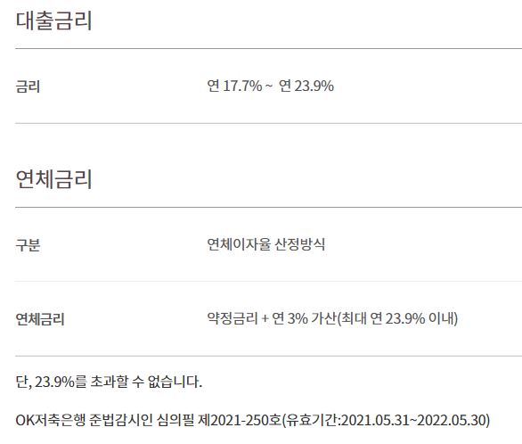 대출금리는 연 17.7%~연23.9% 내에서 제공되는데 이는 고객의 개인신용평점 등에 따라서 차등적용됩니다.